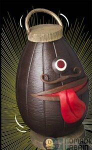 Viennent ensuite les TSUKUMOGAMI (avec 50 g de friture, 55 euros), d’anciens objets devenus vivants et mystérieux. Parmi les plus connus au Japon, le CHOCHIN OBAKE est une lanterne de papier qui revêt une apparence humaine… Elle s’incarne ici en chocolat noir, mais faites attention à son œil hypnotique ou sa langue béante, Dalloyau à de l’humour…