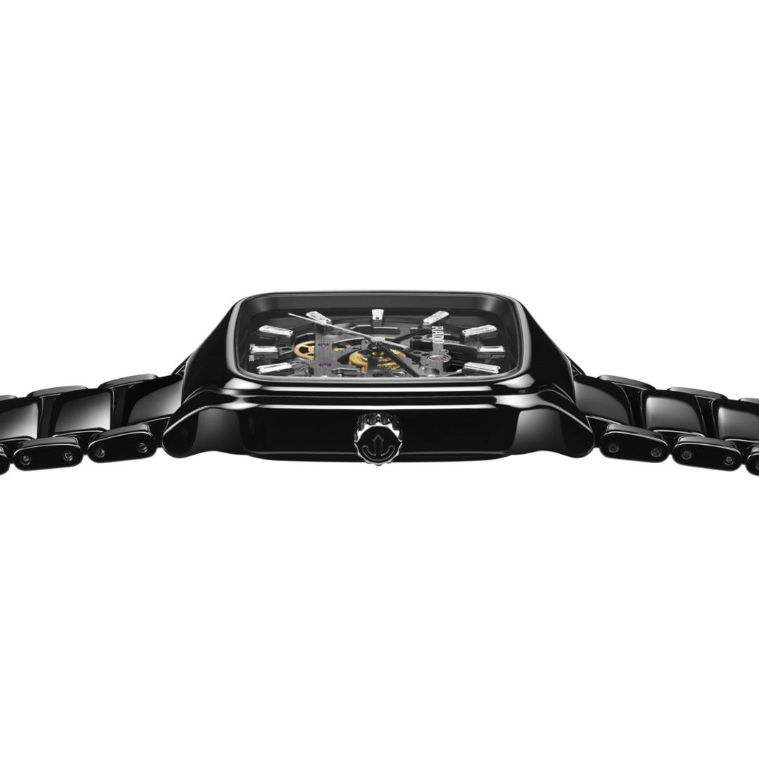 Cette pièce horlogère s’appuie sur le célèbre boîtier carré de la marque qui affiche une largeur de 38 millimètres. La céramique haute technologie noire polie apporte une douceur unique au toucher et une brillance qui flatte immédiatement le regard.