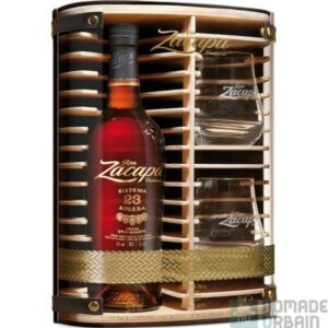 Ce rhum Zapaca allie une belle couleur et une intensité qui se sent en bouche. Elle s’expose dans ce coffret évoquant le bois des fûts utilisés au Guatemala, tout en mettant en scène la bouteille et ses deux verres de dégustation.