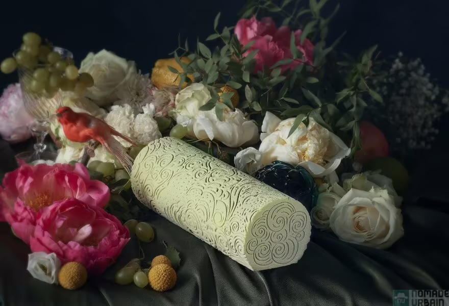 La bûche Infiniment Praliné Pistache dévoile ses facettes dans un écrin comme une scène de théâtre où le dessin prend forme. L’arbre de vie, extrait de son jardin luxuriant, se fait chocolat garni d’un Praliné Infiniment Pistache d’Iran ultra gourmand et se glisse dans le coffret sous la bûche, accompagné de bonbons de chocolat et de gourmandises.