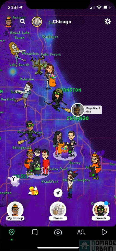 Vous planifiez votre itinéraire pour récupérer des friandises ? Descendez dans la rue avec un nouveau thème effrayant pour la Snap Map, voyez où se cachent vos amis et découvrez leurs costumes Bitmoji directement depuis la Snap Map !