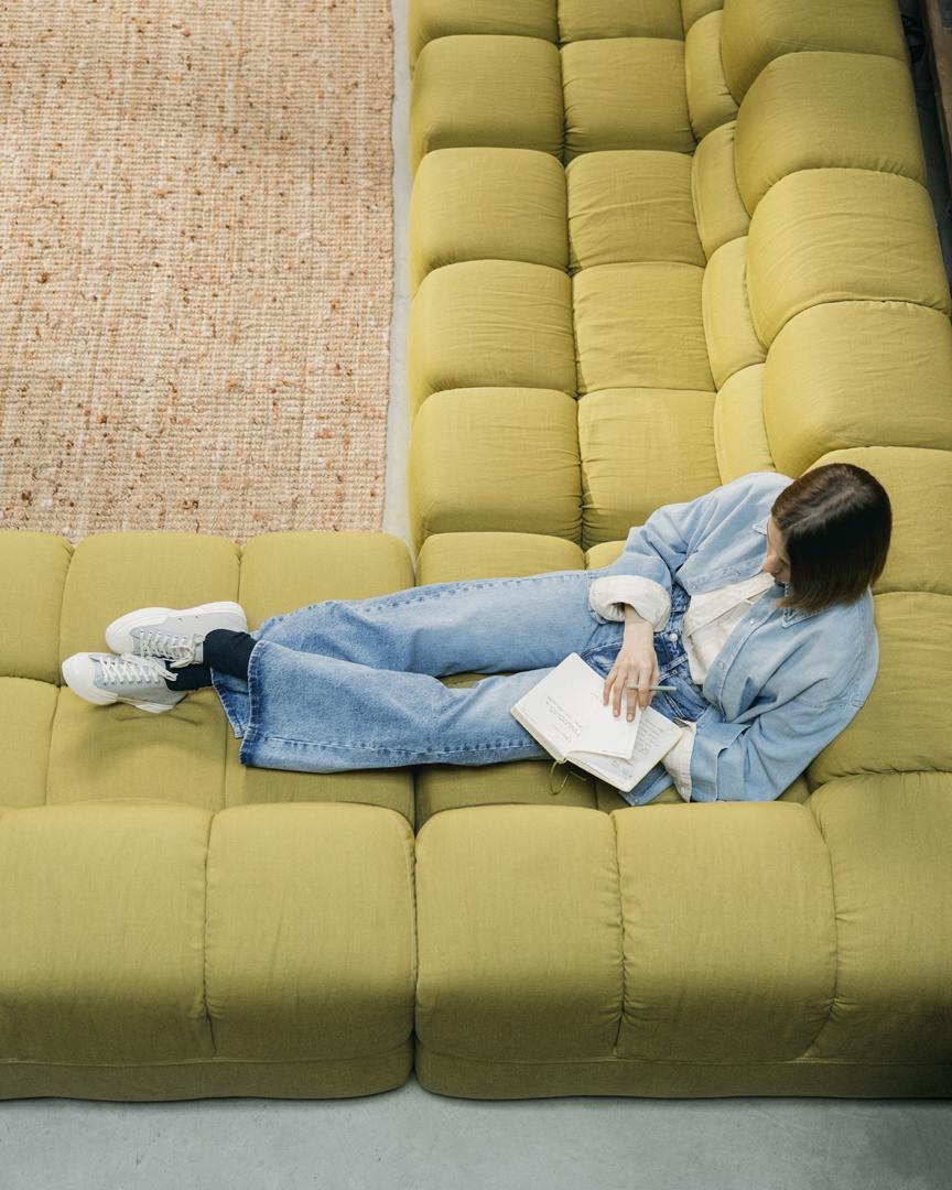 Elle se décline en plusieurs teintes neutres faciles à porter : écru, gris ciment, bleu profond.