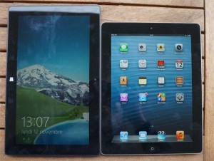 Avec son écran de 10,6 pouces, elle en impose un peu en main. Ainsi, ses dimensions sont 274,6 x 172 x 9,4 mm pour 680 g, là ou l’iPad 4 affiche 241,2 x 185,7 x 9,4 mm et 652 g. Les différences de largeur et de longueurs s’expliquent par le format respectif des tablettes, 16/9 pour Microsoft, 4/3 pour Apple. Malgré les apparences, Surface est aussi fine que l’iPad, ce qui est à saluer.
