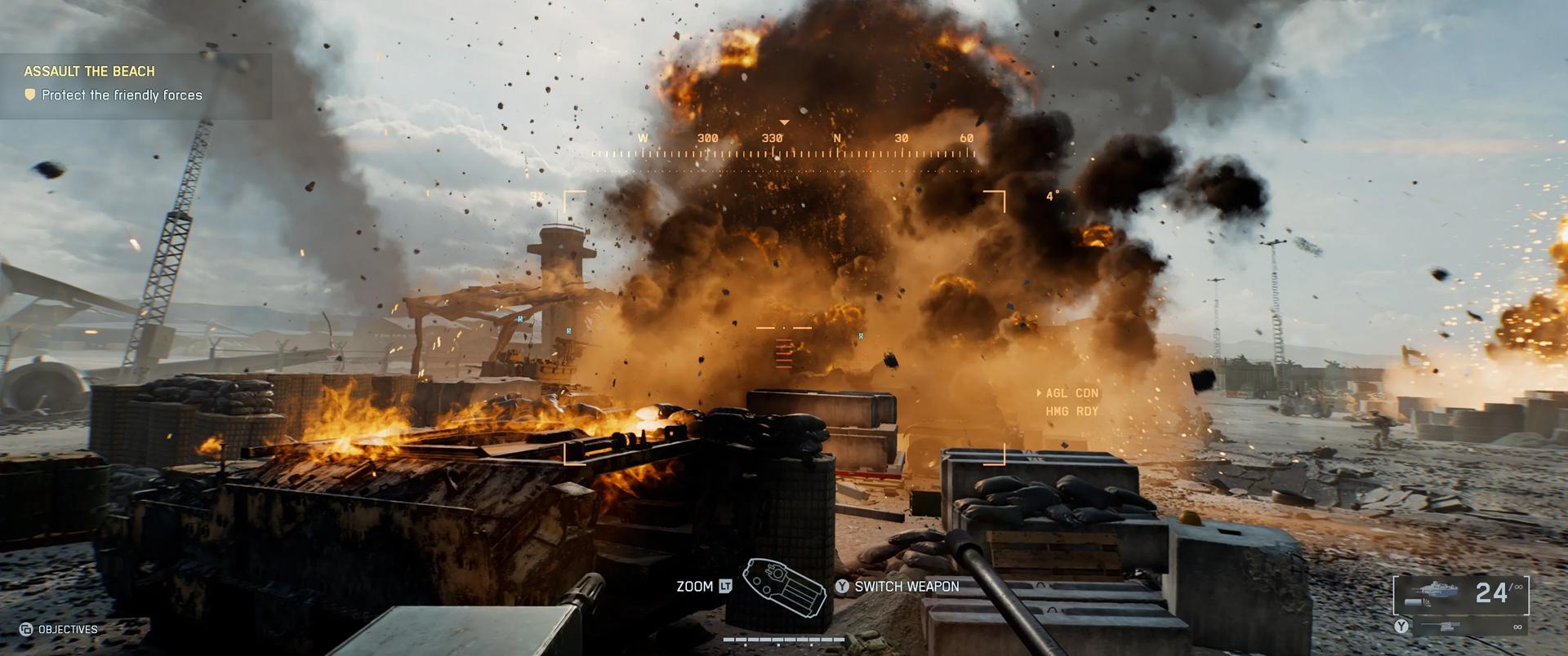Mais aussi des animations de joueurs parfois saccadés, incomplètes. Il n’est pas rare de voir des soldats adverses glitcher ou manquer d’étapes d’animation. Ce qui donne un aspect robotique très daté qui jure avec la beauté des décors. Côté performances, le retour à 64 joueurs soulage le processeur. Sur PlayStation 5 et Xbox Series X, le jeu vise et maintient un 60 images par seconde solide la majeure partie du temps.