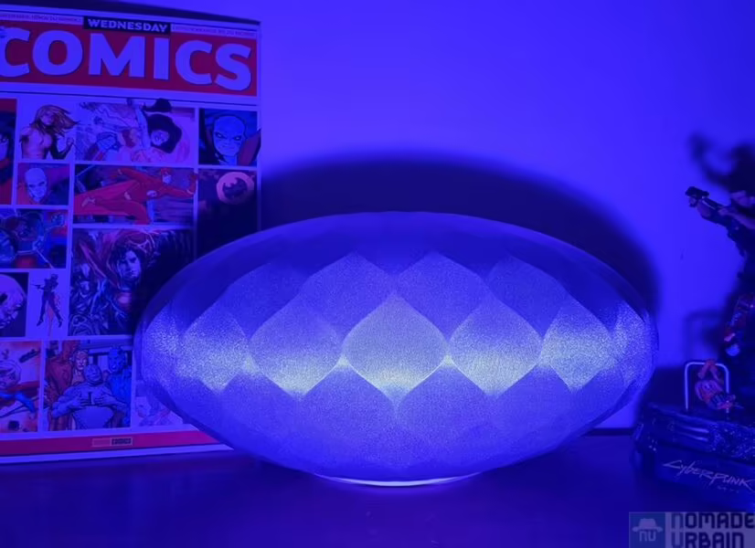 À mes yeux, la mission est réussie. Son design semi-elliptique à 120° est aussi original, qu’esthétique. Il me fait penser à un OVNI avec sa face en « quart » de cercle aussi ronde que galbée. Sa structure en nid d’abeille semble taillée comme un beau diamant. Une robe de tissu argent ou noir, les deux brillants, finissent de l’habiller. Visuellement, je succombe et regrette que la partie arrière soit juste habillée de plastique blanc ou de noir effet bois.