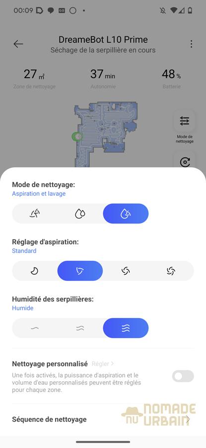 En haut de cette page, au-dessus de la carte centrale représentant votre domicile, se trouvent des informations sur le dernier cycle de nettoyage, notamment la surface nettoyée en mètres carrés et le temps écoulé. Le niveau de charge de la batterie est également indiqué. À droite de la carte, une icône vous permet de configurer les modes de nettoyage du robot : aspiration seule, lavage seul, ou aspiration et lavage combinés. Vous pouvez également ajuster le niveau d’humidité de la vadrouille et la puissance d’aspiration, ces réglages pouvant même être personnalisés pièce par pièce. Il est également possible de définir l’ordre dans lequel les pièces seront nettoyées.