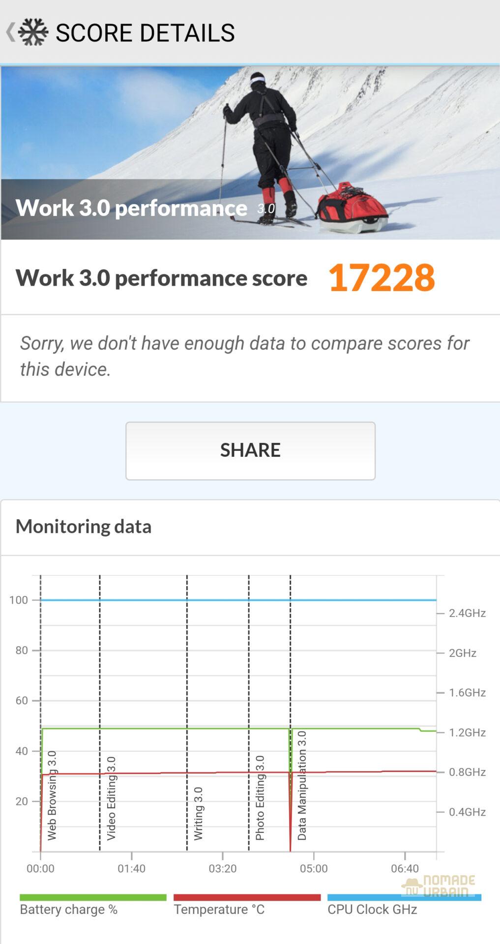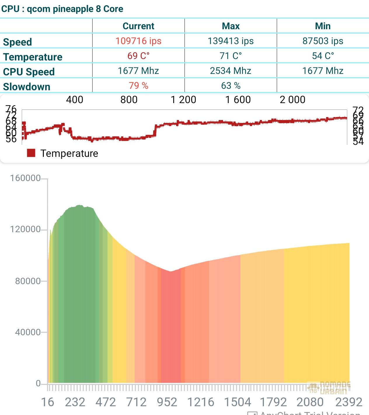 Attention, ces performances sont valides en activant le mode GT, plus énergivore. De plus, après 20 minutes de jeu, le processeur voit ses performances bridées de 21 %, et la température du processeur atteint alors 71° ! Realme parvient ensuite à rétablir la situation avec un bridage entre -27 % et -21 %, tout en maintenant une température acceptable, mais néanmoins désagréable sur la durée.