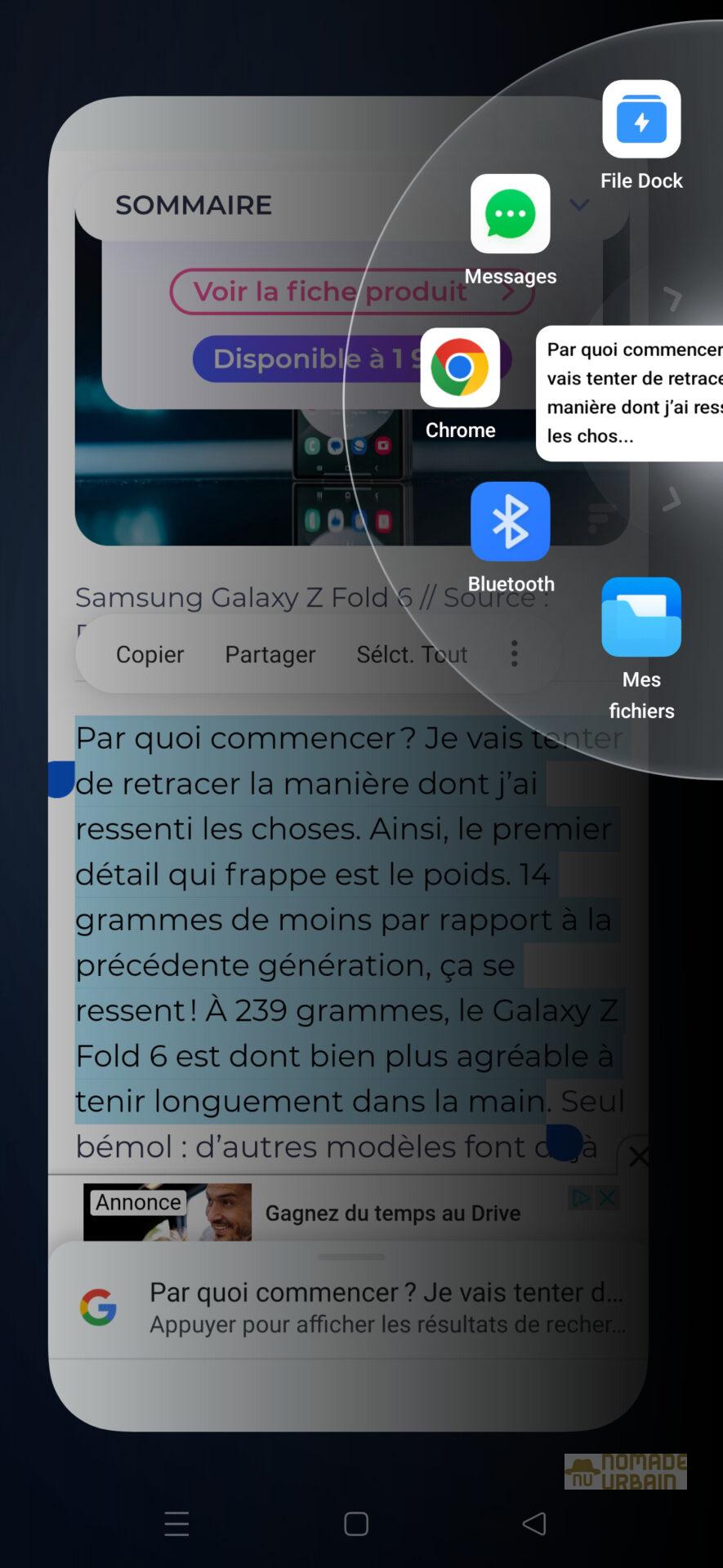 L’intelligence artificielle (IA) occupe également une place importante sur ce GT6, notamment à travers la Boucle Intelligente IA. Cette fonctionnalité permet de gérer plus facilement le contenu de votre écran. Par exemple, en maintenant appuyé un message ou une image, puis en déplaçant ce contenu vers la droite, une boucle s’affiche avec les applications les plus pertinentes. Si vous sélectionnez une adresse, par exemple, Google Maps sera automatiquement proposé en premier. Bien que la Boucle Intelligente ne fonctionne pas encore avec tous les éléments. C’est une innovation prometteuse qui simplifie l’interaction avec votre smartphone.