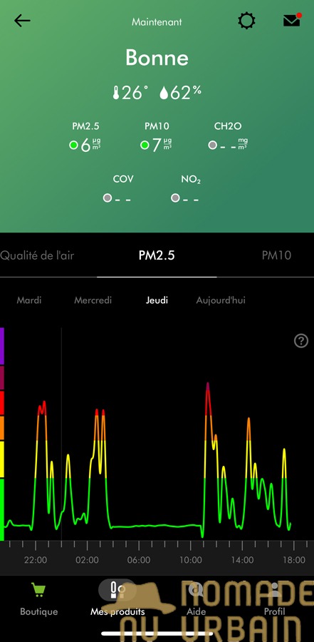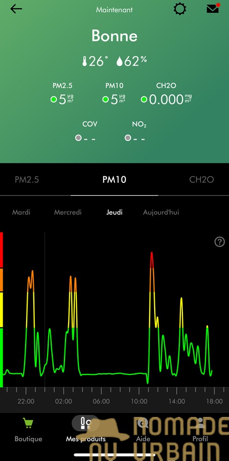 Les graphiques interactifs permettent de visualiser l’évolution des relevés heure par heure. Vous pouvez ainsi identifier les pics de pollution, observer les fluctuations de l’humidité, ou encore suivre l’efficacité du mode automatique après chaque déclenchement du purificateur.