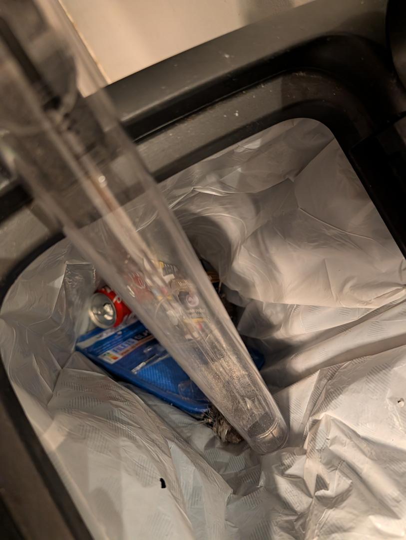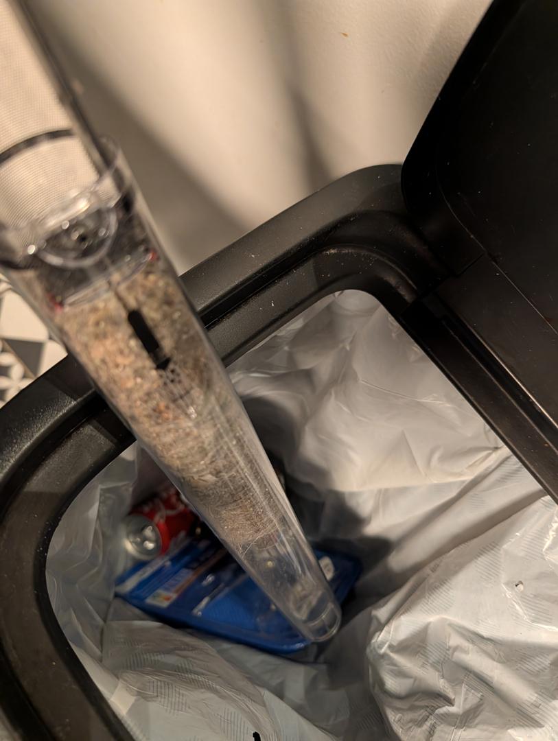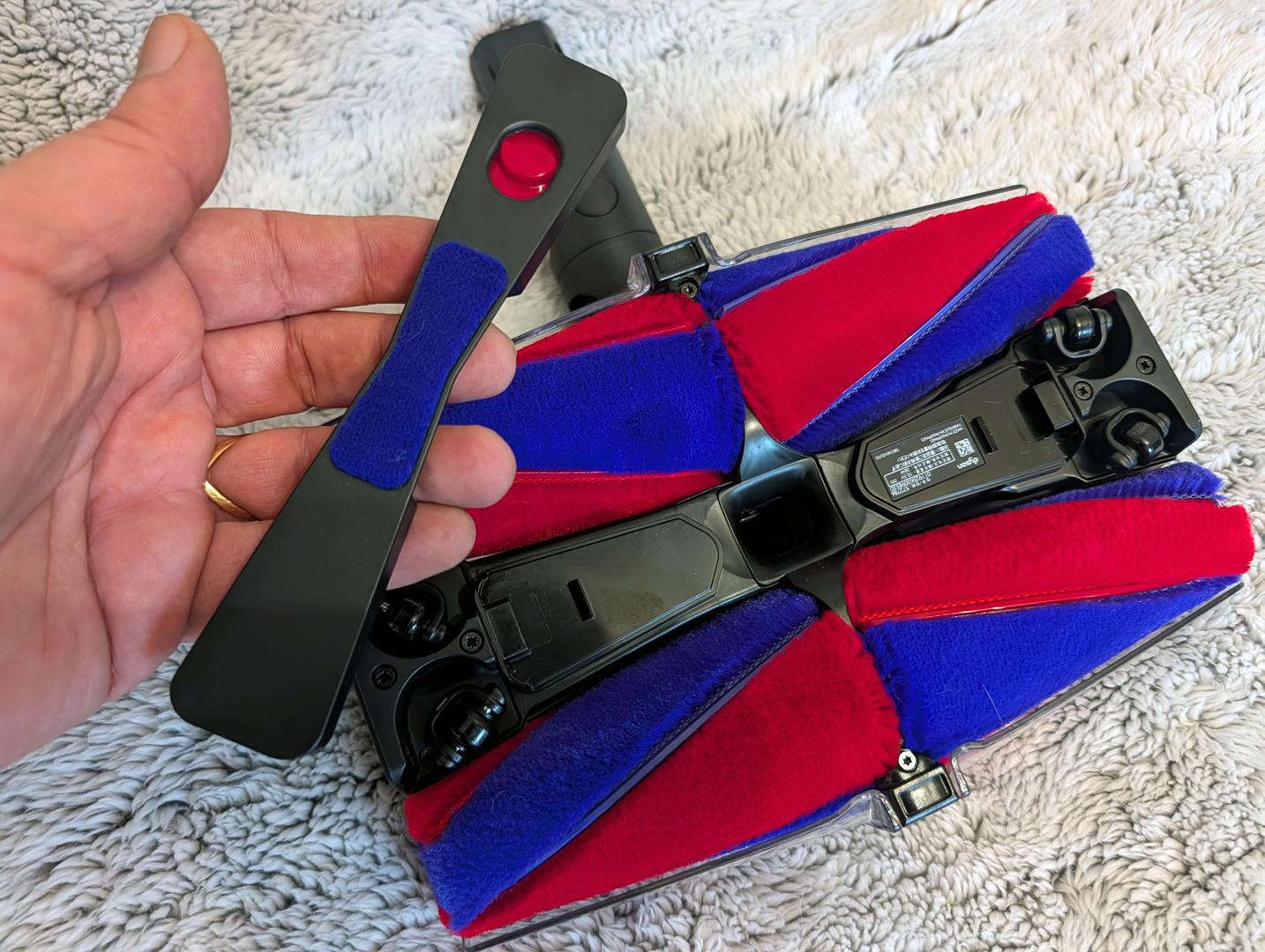 Une fois un cycle d’aspiration terminé, vous devez donc détacher la brosse, puis placer l’aspirateur au-dessus d’une poubelle et ouvrir le bac en appuyant sur le bouton mécanique rouge en bas du manche.