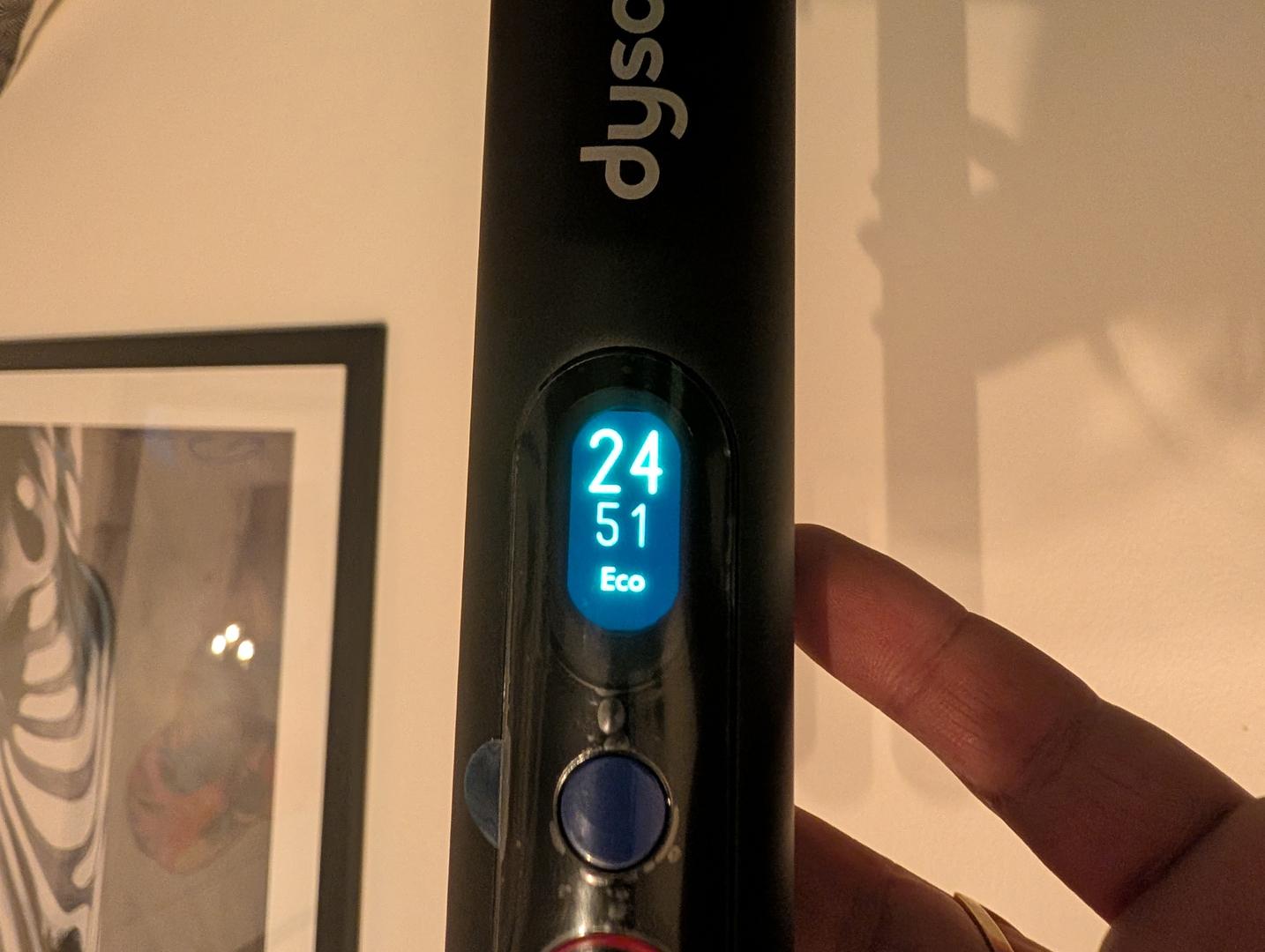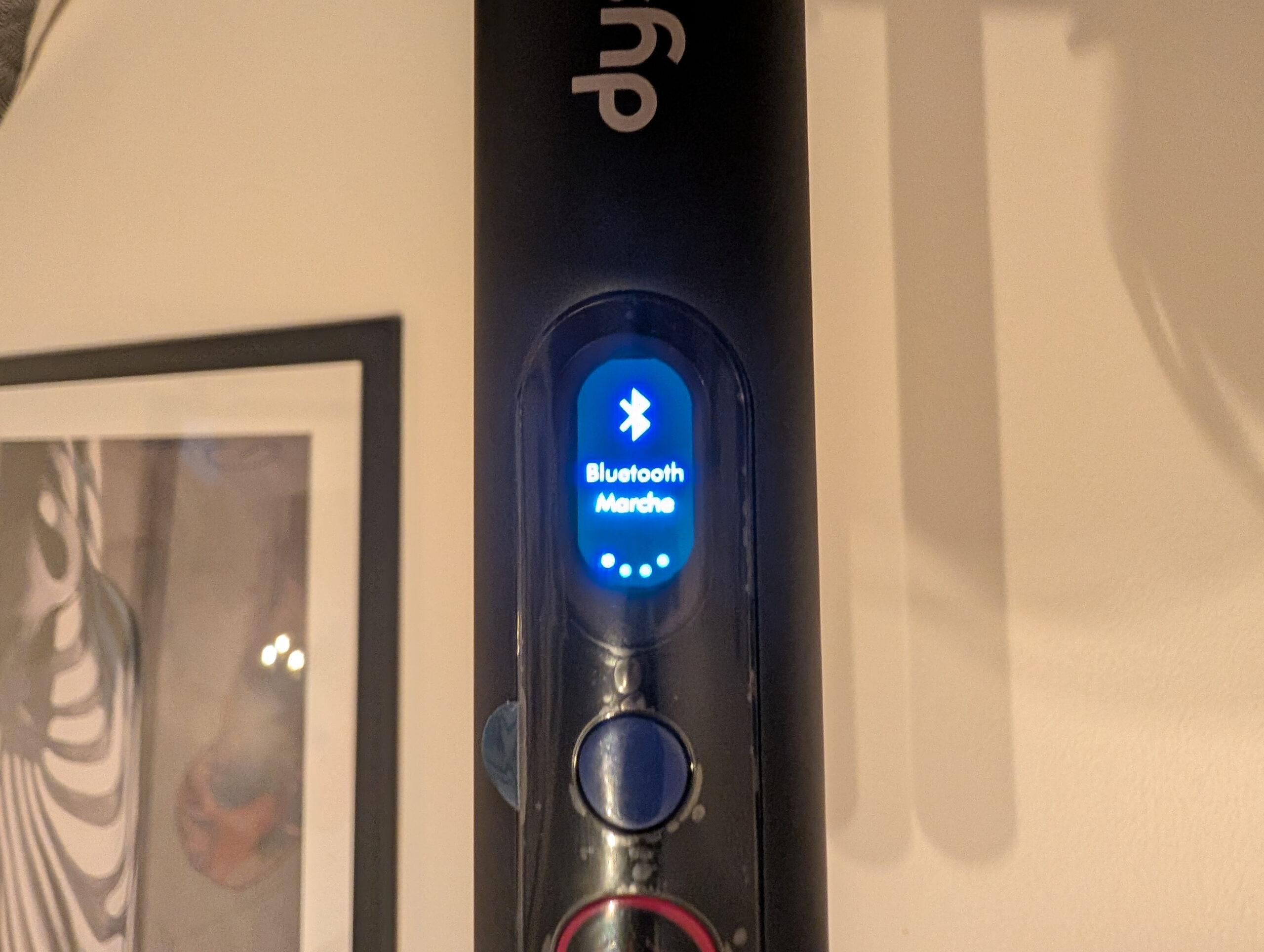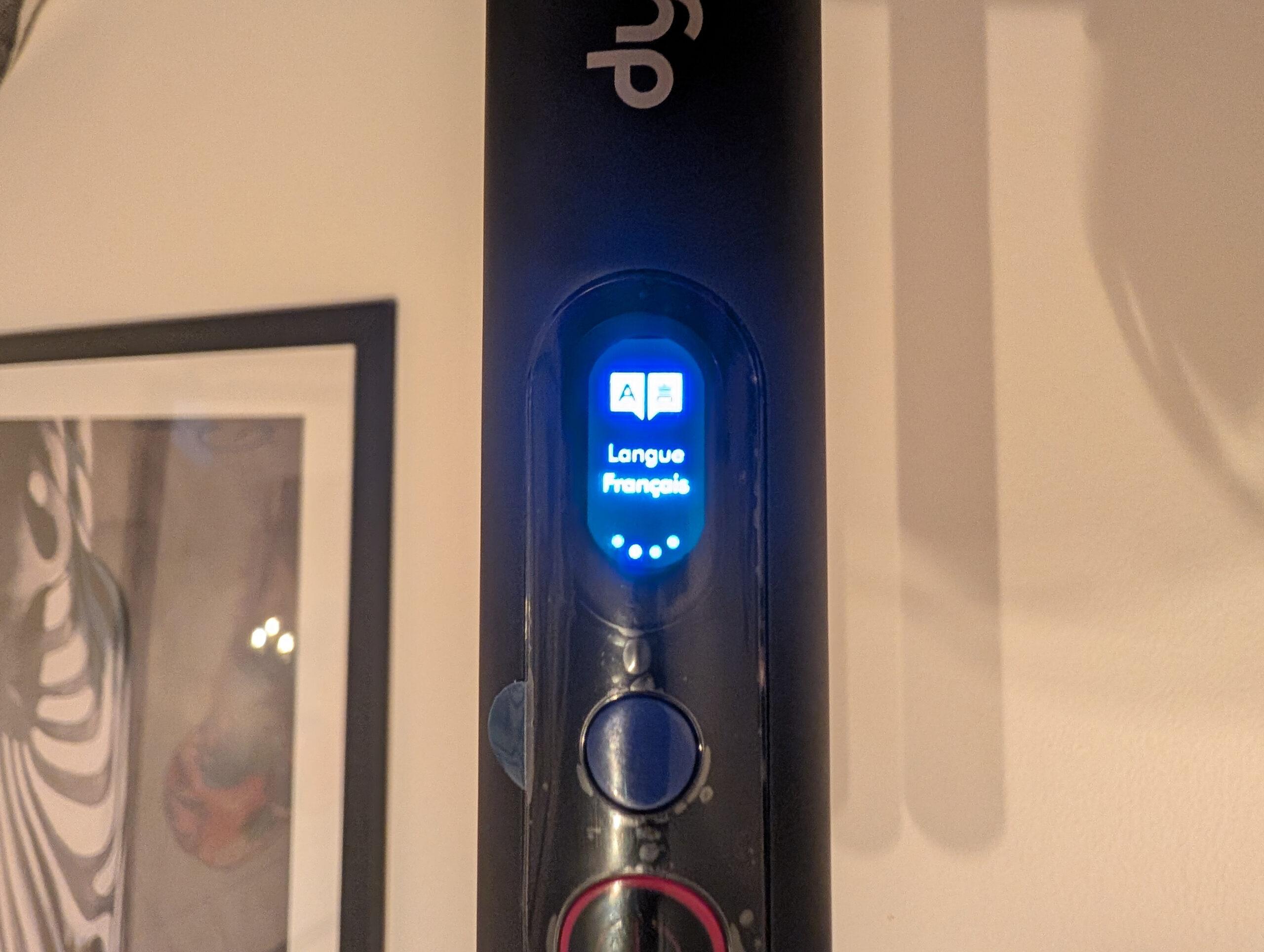 Ensuite, il permet de naviguer dans le menu des paramètres qui s’affiche sur le petit écran LCD couleur. Nous pouvons d’ici rendre appairable en Bluetooth l’aspirateur, changer la langue… L’écran LCD indique à l’usage le niveau de batterie, qu’il exprime en pourcentage au démarrage et en temps d’usage restant lorsque nous l’utilisons. Juste en dessous de ce chiffre s’affiche le niveau de puissance. L’ensemble est efficient et offre une très bonne lisibilité.