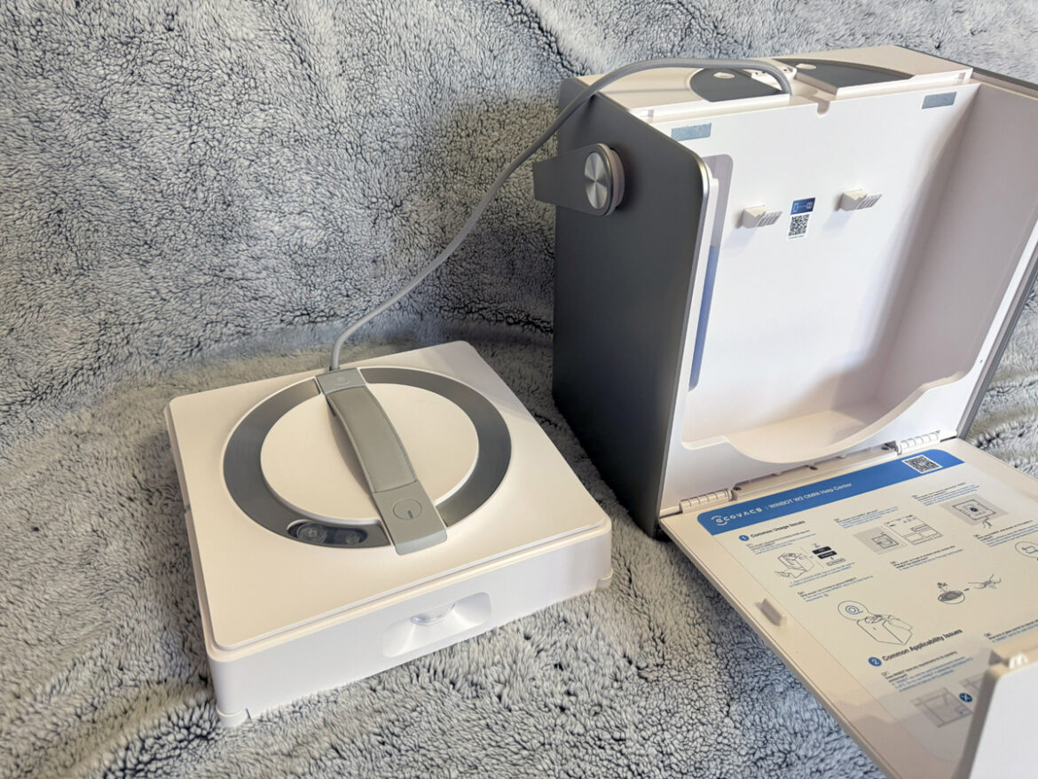 Le W2 Omni se distingue par sa mallette de transport, qui combine design élégant et praticité. L’installation est rapide : placez la mallette devant la fenêtre, allumez-la et ouvrez-la. Une fois la serpillière humidifiée et fixée sur le robot, il vous suffit de positionner le robot sur la vitre et d’appuyer sur le bouton de démarrage.