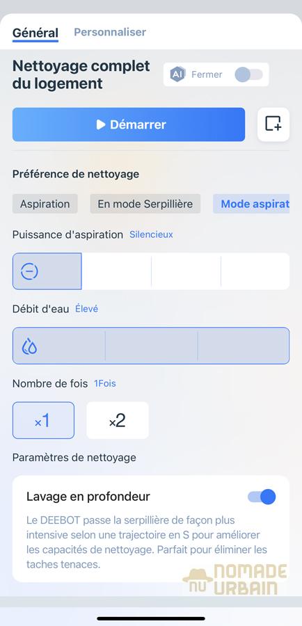 Le panneau de commande a été entièrement repensé. Un grand bouton Démarrer permet de lancer un cycle de nettoyage et se transforme en bouton pause pendant l’exécution. À sa droite, un bouton permet de lancer un nettoyage de zone spécifique. Vous pouvez également configurer le cycle en sélectionnant le mode de nettoyage : Aspiration, Serpillière ou Aspiration et Serpillière combinées. Vous pouvez ensuite ajuster le niveau de puissance d’aspiration et le débit d’eau pour humidifier la vadrouille. Il est également possible de choisir si le robot doit faire un ou deux passages.