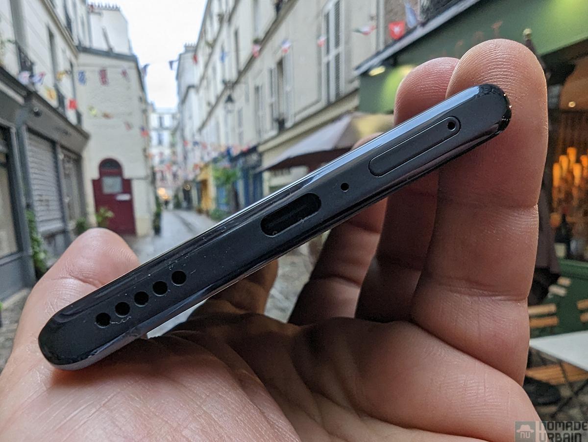 Sur la tranche inférieure, nous avons le port USB3-C, le cache permettant de placer deux cartes nano-SIM. Il n’est pas possible de rajouter de carte microSD. Ensuite, l’unique haut-parleur est situé ici et vous constaterez rapidement qu’il est un peu souffreteux. Niveau connectiques sans-fil, nous avons droit au Bluetooth 5.1 et au Wi-Fi 6.