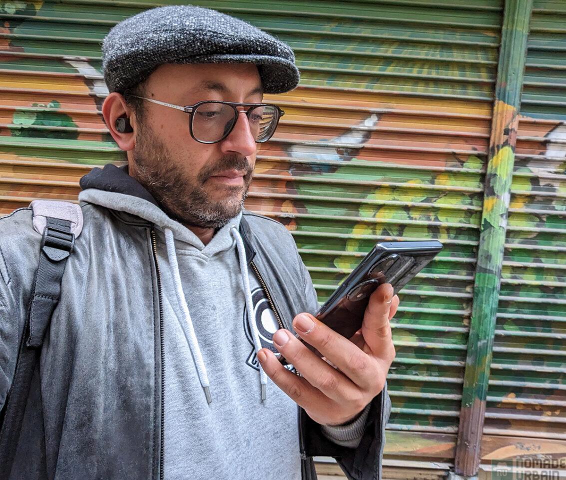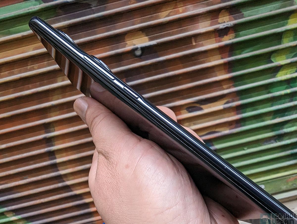 Sur la tranche droite se trouvent les boutons dédiés au volume, ainsi que celui de mise en marche. Ils manquent un peu de relief, mais rien qui ne puisse réellement nuire à leur usage quotidien. Il faut surtout s’y habituer, car le design incurvé réduit l’espace disponible pour eux.
