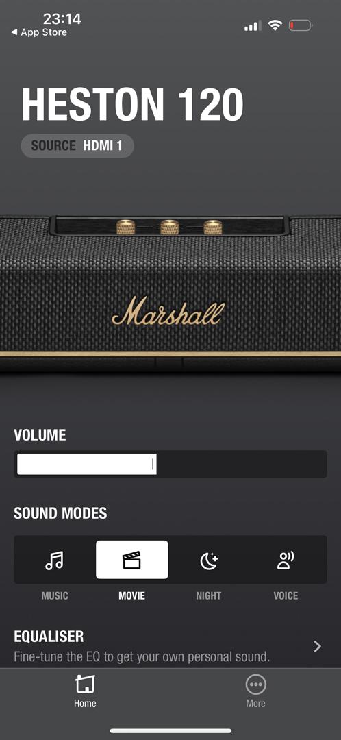 L’application Marshall est plutôt séduisante avec ses tons gris dégradés et ses éléments très bien segmentés. Elle reproduit les commandes physiques de la barre de son avec clarté. La mise en marche se fait lors de la connexion et une barre permet de gérer facilement le volume. Les modes audio sont accessibles par un appui, et nous avons surtout l’égaliseur 5 bandes.