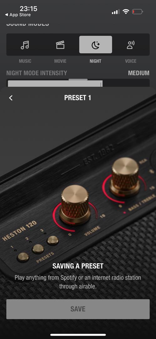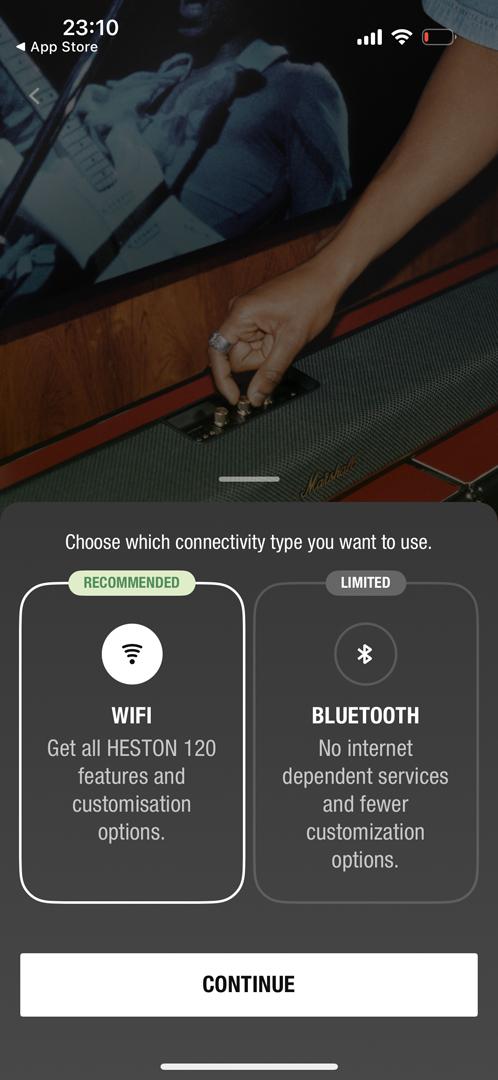 L’application Marshall utilisée est la même que celle pour les casques sans fil de la marque. Avant tout, il faut installer l’application et lancer la recherche de la barre de son. L’appli nous rappelle de passer le produit en mode Wi-Fi ou Bluetooth selon votre préférence. Si vous optez pour la seconde solution, il faut tout de même prendre le temps d’associer la Heston 120 à votre réseau Wi-Fi. Cela permet d’utiliser rapidement la partie streaming, qui sera de meilleure qualité qu’en passant par le Bluetooth.