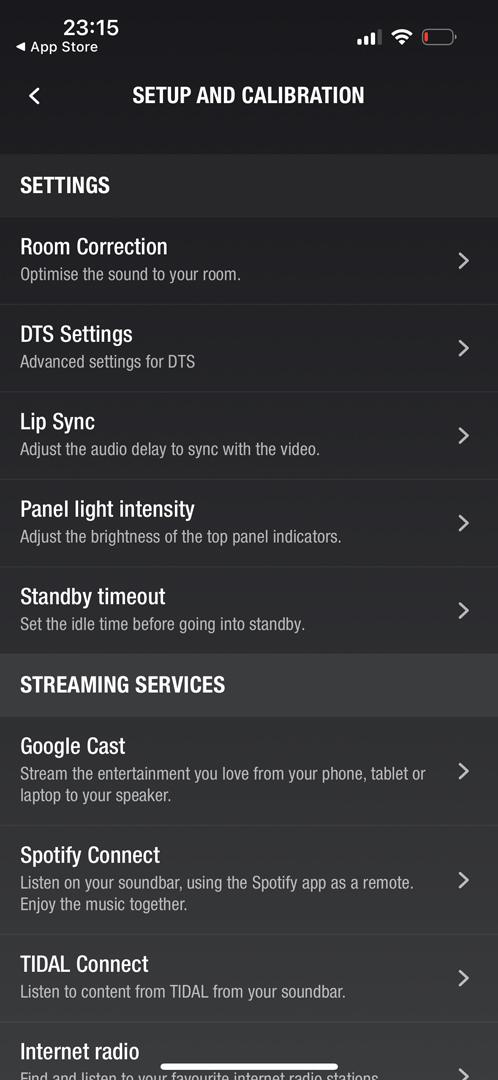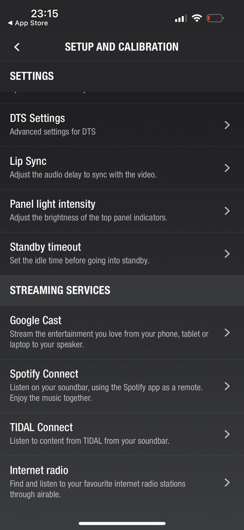 Ensuite, vous pouvez affiner les paramètres qui vont des paramètres du DTS au décalage audio des dialogues, en passant par l’intensité des LED qui encerclent les potentiomètres de la Heston 120. La seconde partie du menu des Paramètres a pour rôle de paramétrer vos services de streaming et ainsi y accéder directement depuis la barre de son.