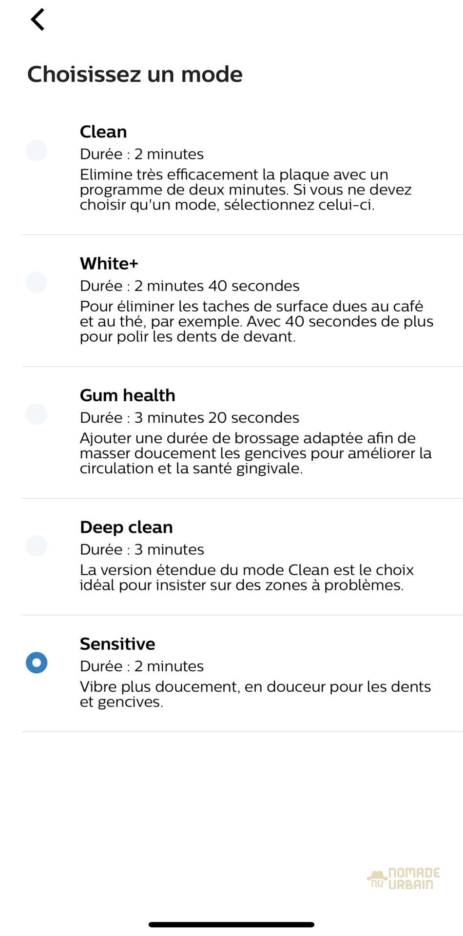 Une fois l’application configurée, elle se connecte automatiquement à la brosse dès que vous la prenez en main. Elle permet de personnaliser les modes de brossage selon vos préférences. Voulez-vous un brossage qui prend soin des gencives, qui va en profondeur ou un mode spécial dents blanches ?