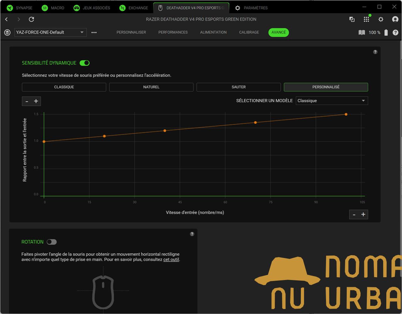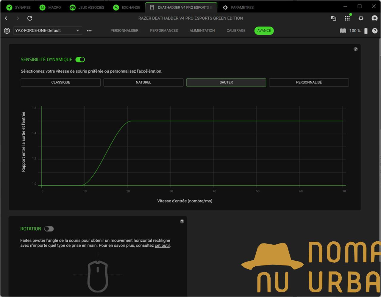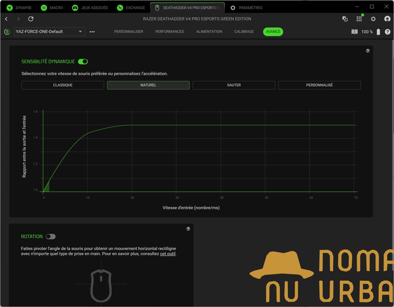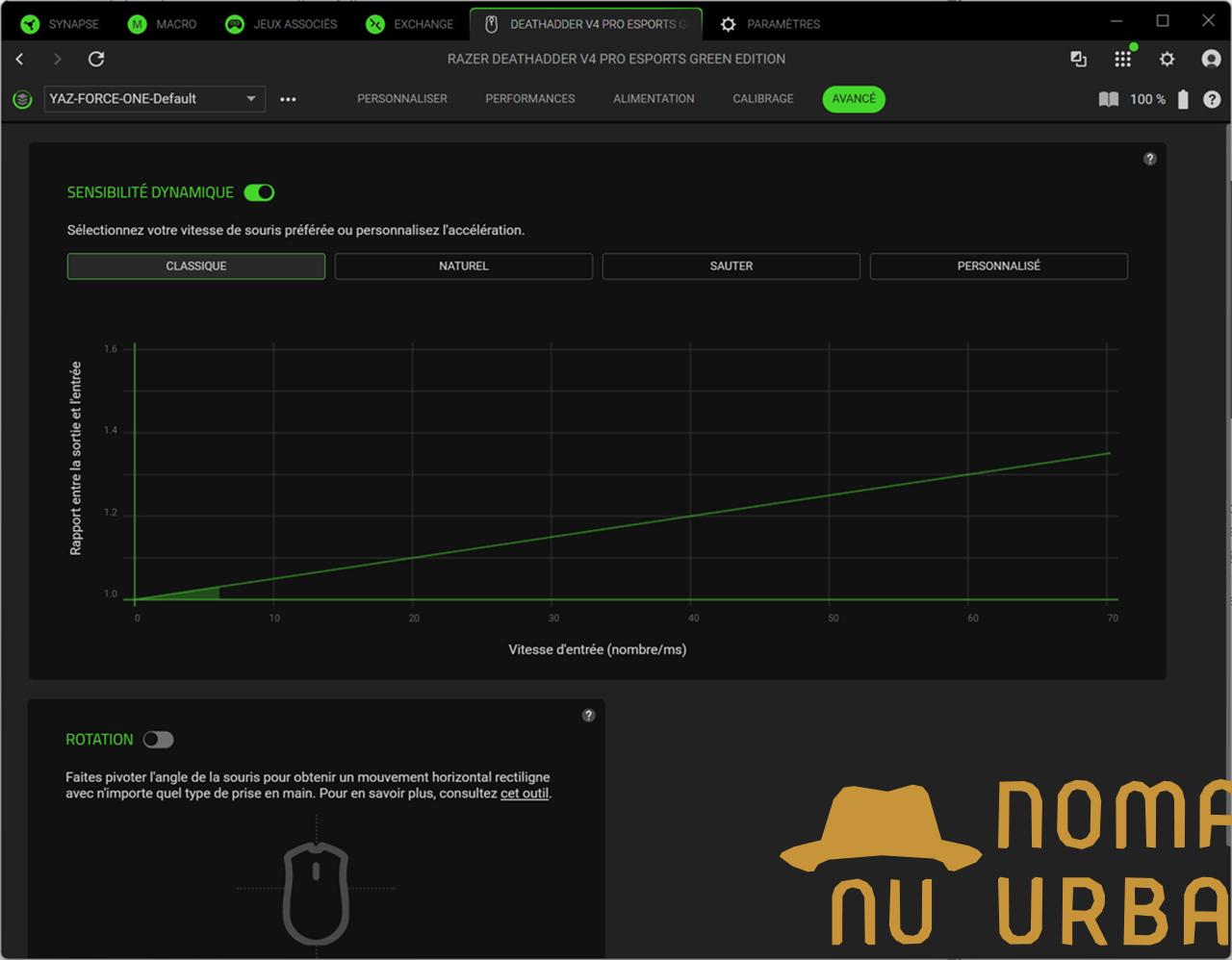 Enfin, je ne peux pas passer à côté de l’option Rotation. Personnellement, j’utilise ma souris droite, mais je connais de nombreuses personnes qui lui donnent un angle avec le poignet. Or, dans des jeux compétitifs, cela peut perturber le capteur, qui n’interprète pas parfaitement le geste. Cela se joue au pixel à l’écran, mais parfois, cela suffit entre perdre et vaincre. Synapse permet donc d’entrer cet angle afin que le capteur s’adapte à cette donnée.