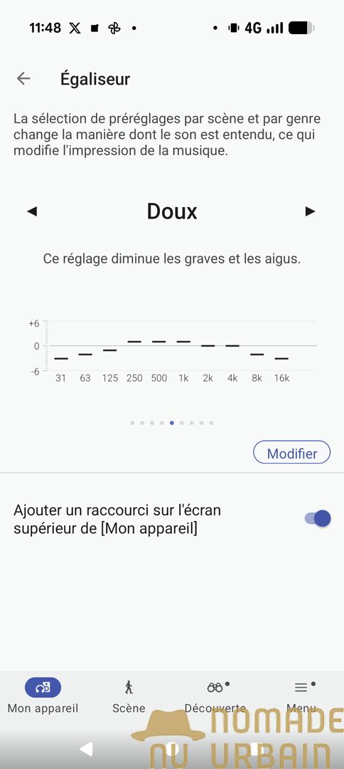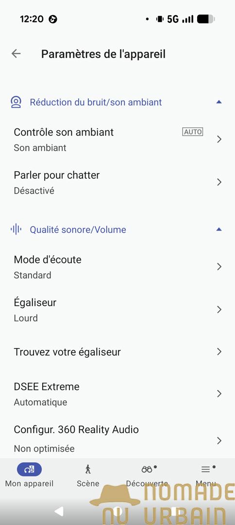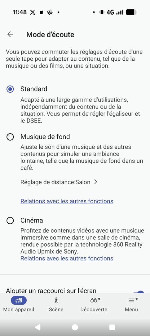 La page dédiée au XM6 affiche le produit sur le tiers supérieur de l’écran et, juste en dessous, nous avons le niveau de batterie et le type de codec utilisé. Puis vient le contrôle de son ambiant, qui permet de choisir entre Réduction de bruit, Son ambiant et tous les traitements ANC désactivés. Vient ensuite le mode d’écoute, qui permet de créer un fond sonore comme si vous étiez dans un café ou une salle de cinéma. Alors oui, cela est assez convaincant, mais nous ne comprenons toujours pas l’intérêt.