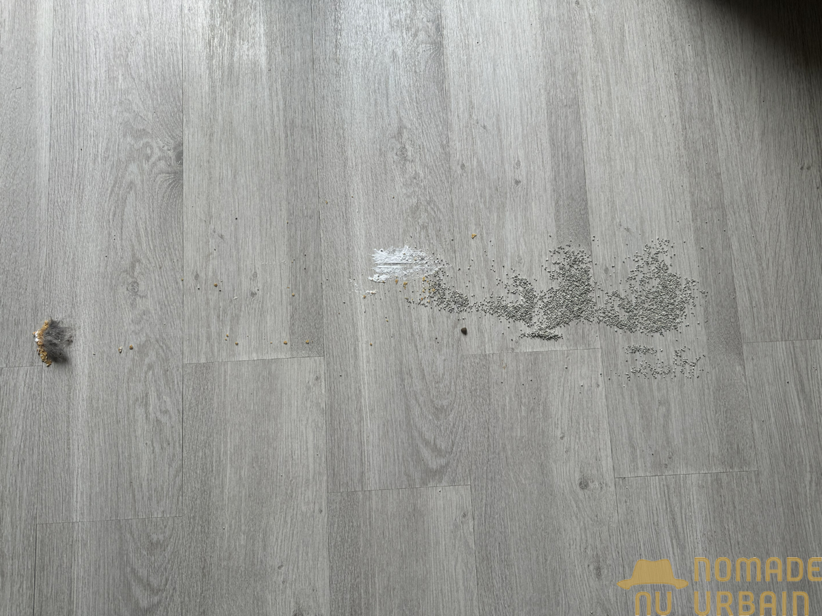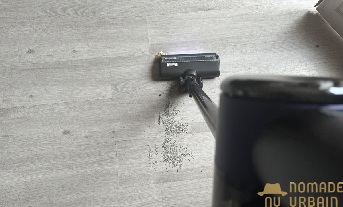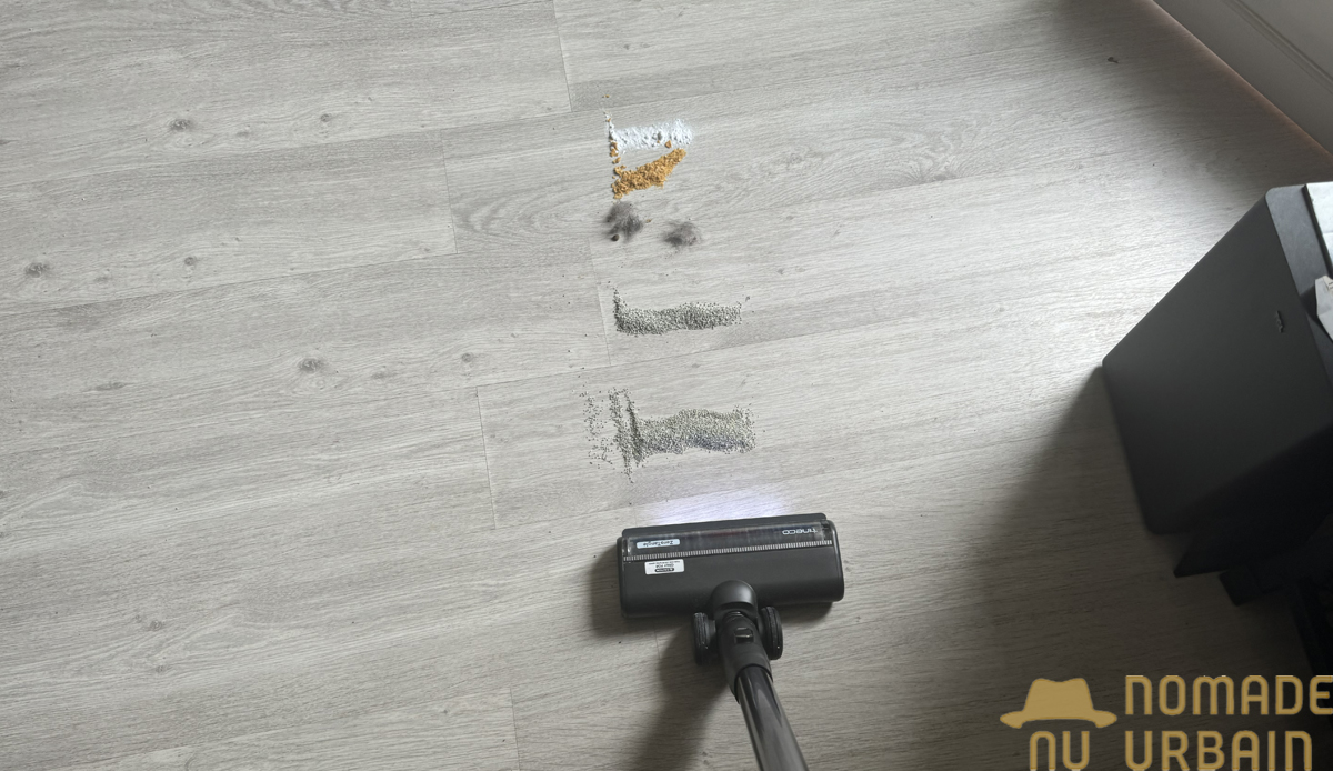 Le rendement sur sol dur s’avère très convaincant, et cela malgré un moteur léger qui pouvait laisser craindre l’inverse. En comparaison, un Dyson Gen V5 ou un Roborock Dyad termine la même scène en un passage ou un aller-retour au maximum, mais ces références sont vendues environ 900 € et 1 400 €.