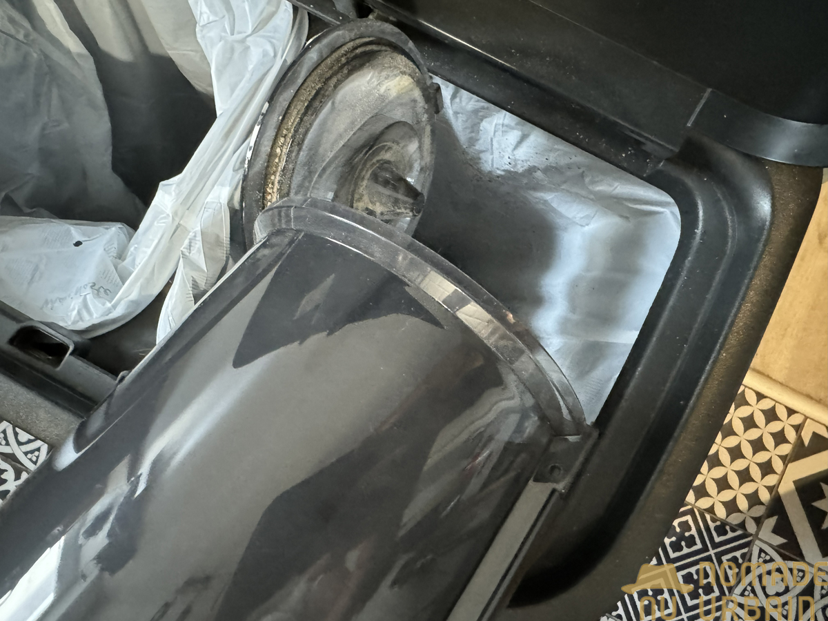 L’opération reste rapide, le retrait du bac se fait en quelques secondes. Pour éviter un nuage de poussière, insérer le bac le plus profondément possible dans la poubelle avant de l’ouvrir. Dernière précaution utile, ne jamais aspirer de zones humides. Les résidus organiques se dégradent alors et engendrent moisissures et mauvaises odeurs.