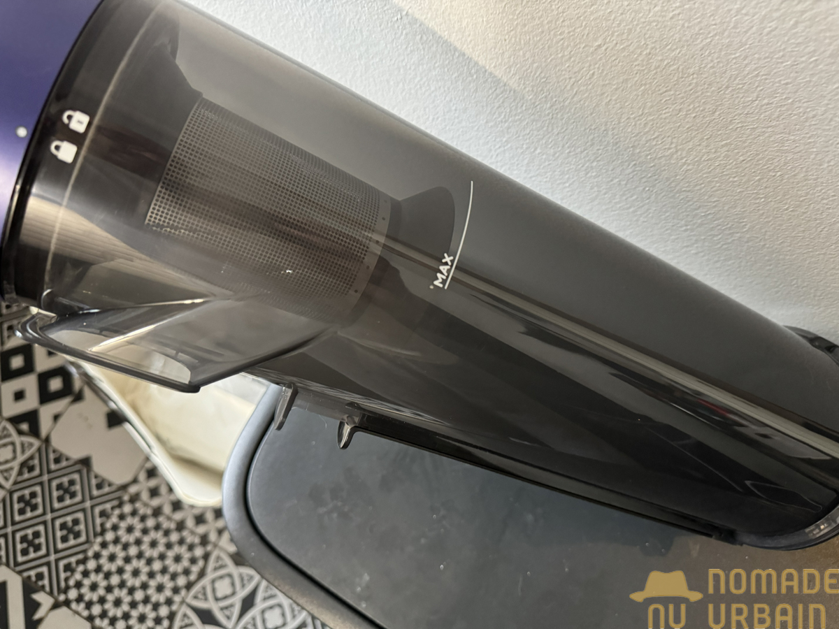 Le bloc d’aspiration se distingue par son format mini et un poids de 1,22 kg seulement, alors que le moteur est annoncé à 270 W. Il regroupe le moteur, un bac à poussière de 0,6 L et la filtration. La qualité de fabrication est là, pas parfaite mais cohérente avec le prix en étant pas loin du haut de gamme, mais pas tout à fait.