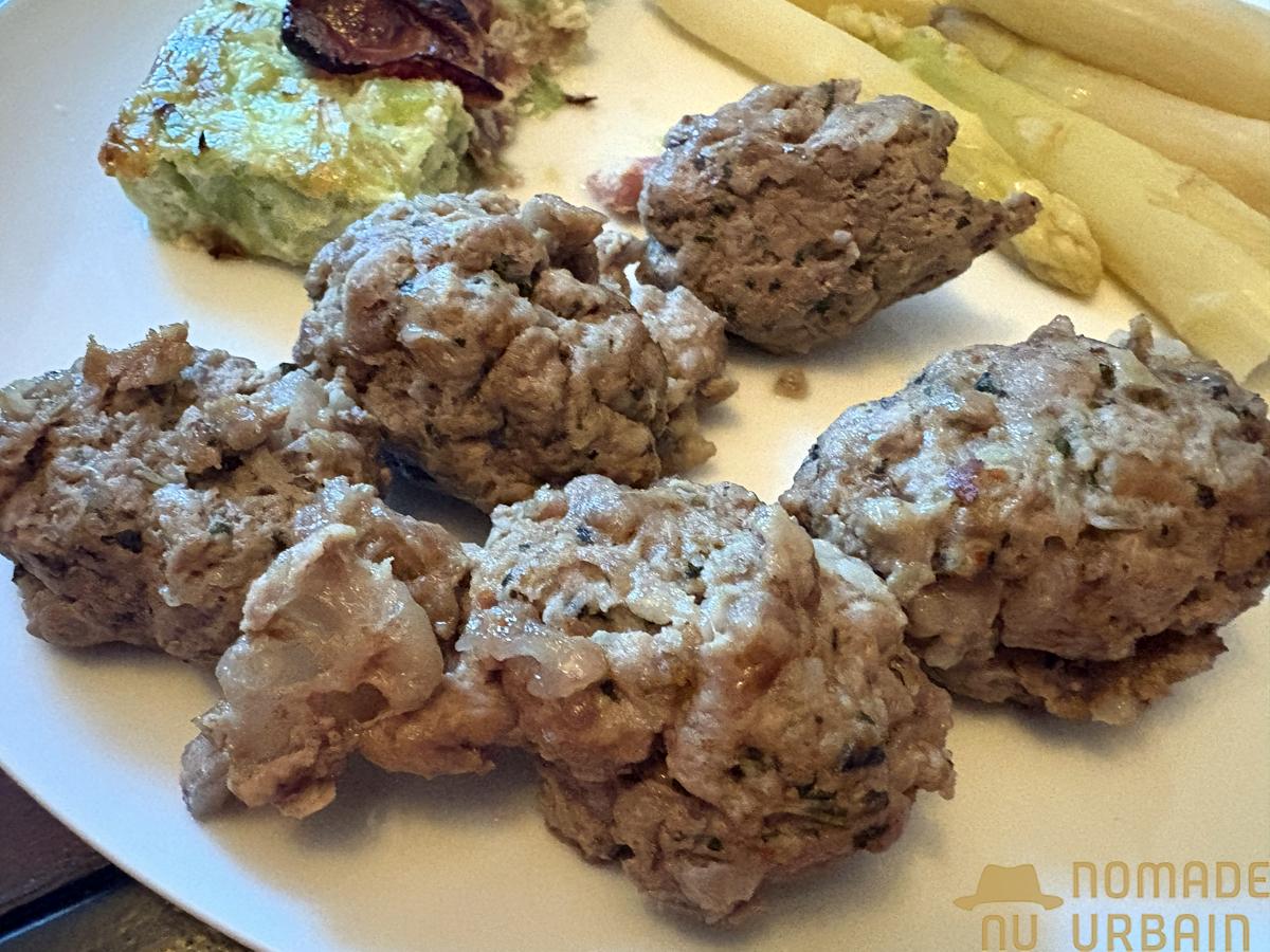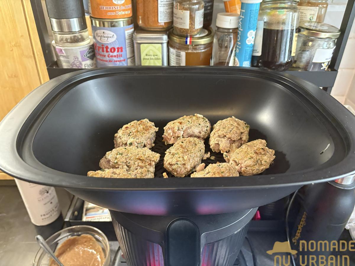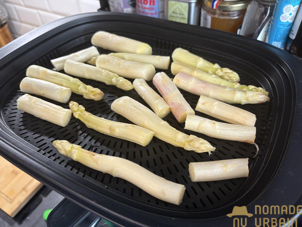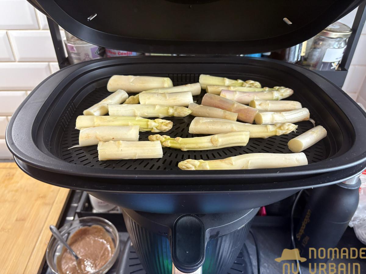 J’ai ensuite testé les deux niveaux du Varoma, avec des keftas dans le premier bac, celui qui est creux, et des asperges sur le supérieur plat. En suivant les instructions de l’appareil, j’obtiens une cuisson impeccable et surtout synchronisé.