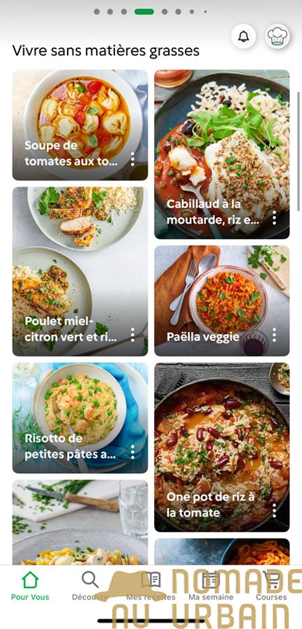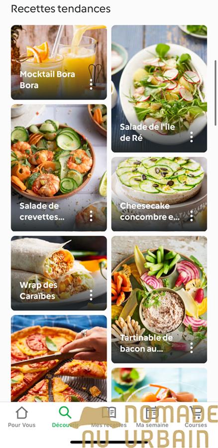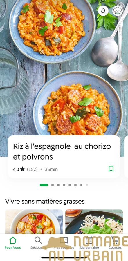 Cinq icônes en colonne organisent toute la navigation. La page d’accueil regroupe les suggestions du moment. Le moteur de recherche filtre par type de cuisine, par ingrédient, par budget, par saison et par contrainte alimentaire : végétarien, sans gluten et bien d’autres encore.