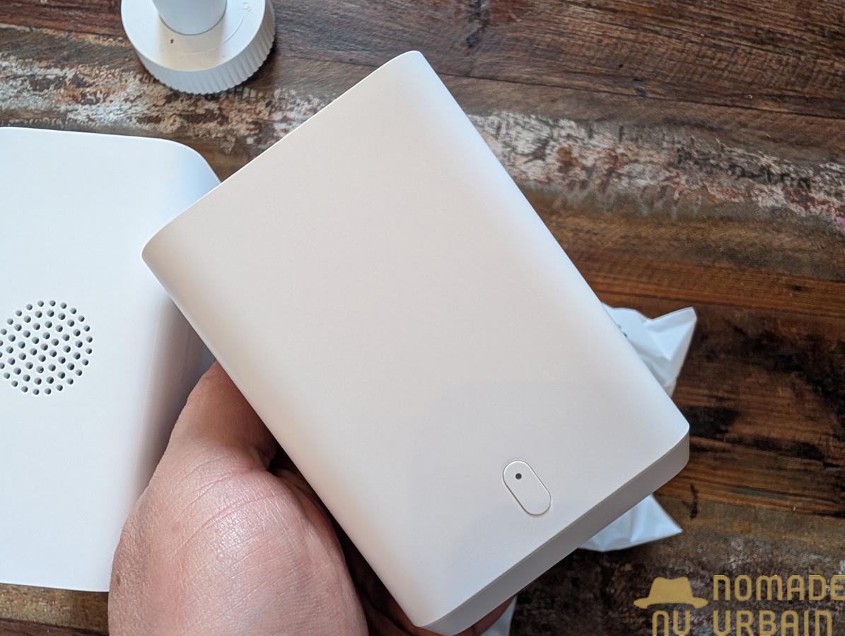 Au dos de l’appareil se trouve le pas de vis pour l’installation murale. Un cache en silicone protège le port de charge USB-C ainsi que le bouton de réinitialisation.