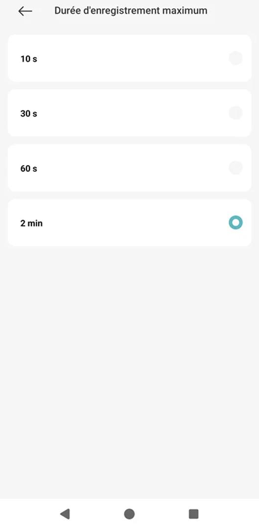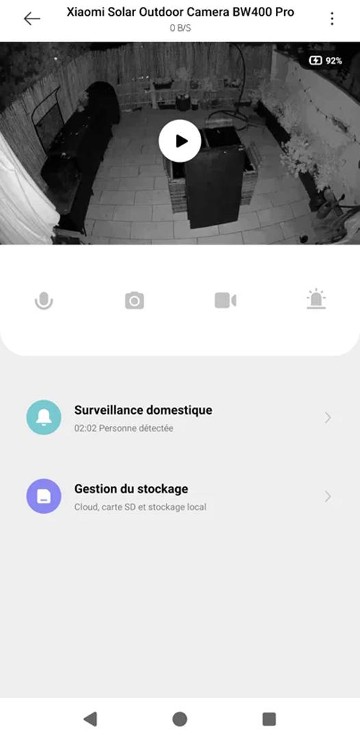 En tapotant sur cette fenêtre de visionnage, vous accédez aux données techniques et aux réglages rapides. La partie haute affiche la date, la qualité du signal réseau et le pourcentage de batterie. Des icônes permettent de piloter la torche LED, de couper le son ou d’ajuster la définition de l’image. Un bouton sert aussi à basculer en plein écran. Juste en dessous, une barre de commandes offre des actions immédiates : activation du micro pour parler, prise de photo instantanée, lancement d’un enregistrement manuel ou déclenchement de la sirène.