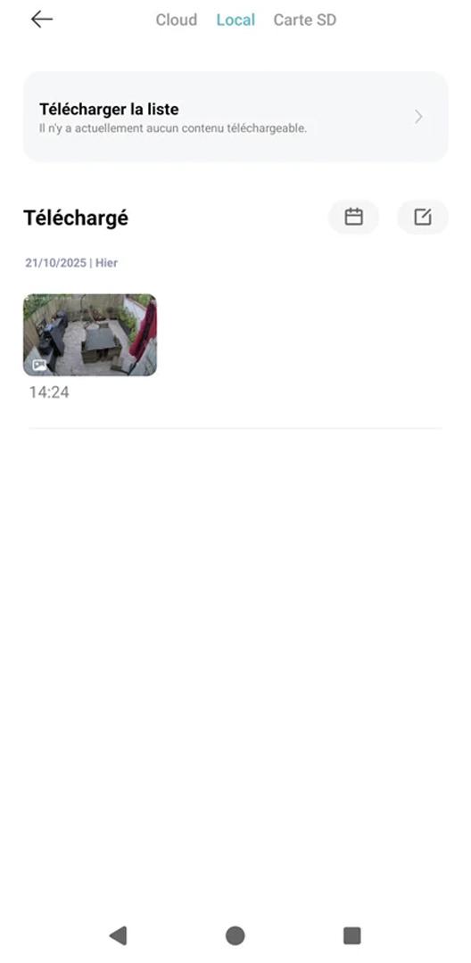 L’onglet Gestion du stockage permet de visionner les archives selon trois sources : le Cloud Xiaomi (option payante), le dossier Local (fichiers stockés sur le téléphone) ou la Carte SD (séquences enregistrées physiquement sur le hub).
