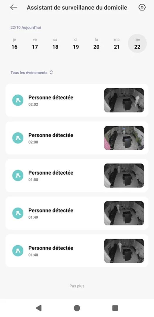 Le bas de l’écran se divise en deux onglets distincts pour la gestion des événements. Le menu Surveillance domestique liste l’historique des alertes de détection.