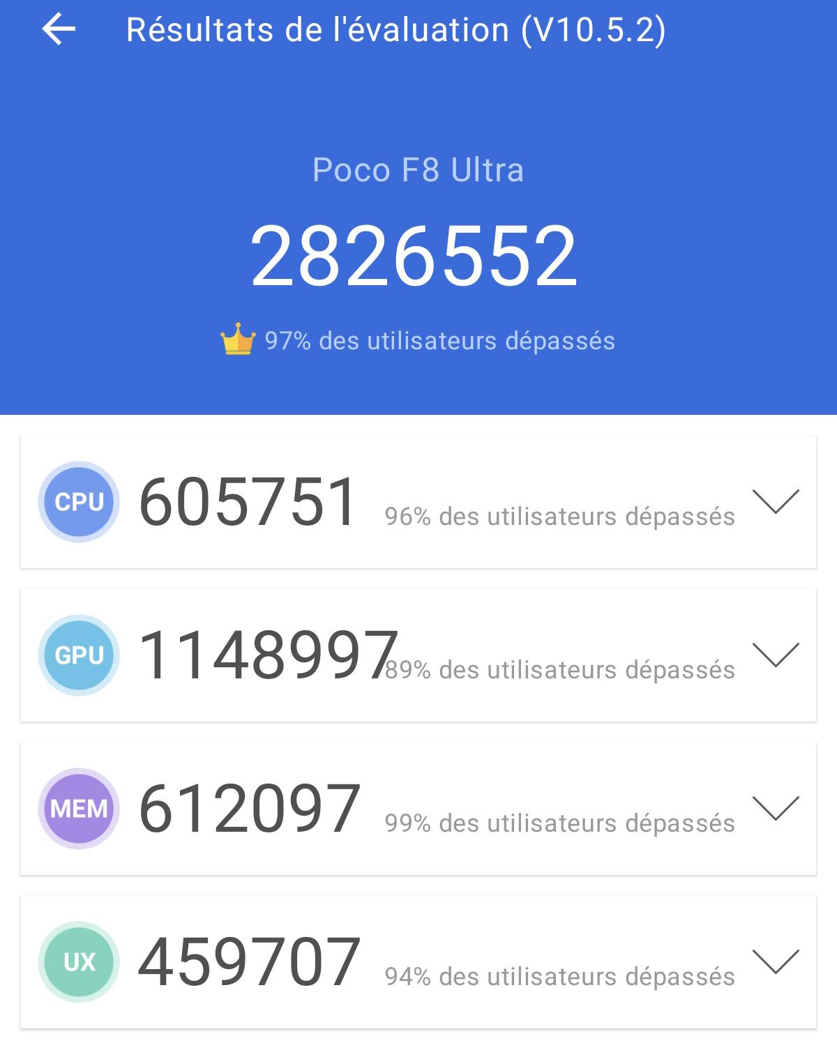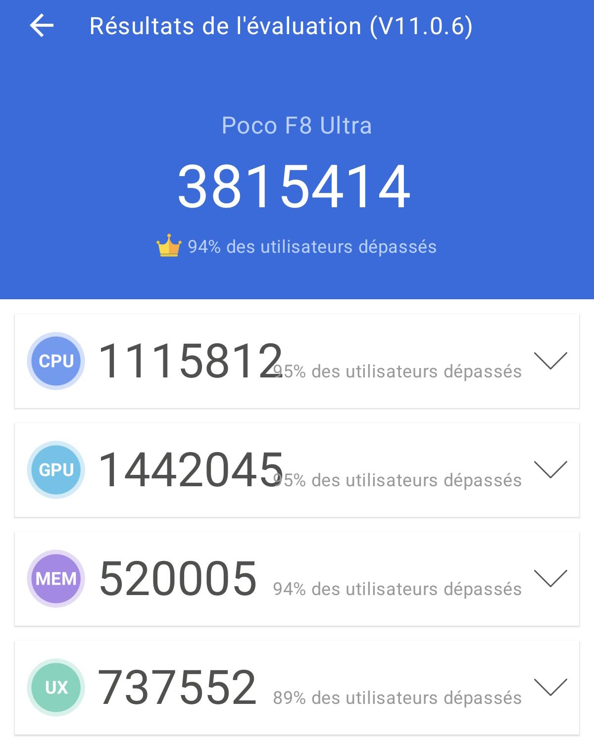 Au quotidien, la fluidité est absolue. Les applications les plus lourdes, tel l’encodage 4K, s’exécutent avec une rapidité déconcertante. Les benchmarks confirment cette puissance : si Xiaomi revendique fièrement un score de 4 millions sur Antutu 11, nos mesures atteignent un très proche 3 815 414 points. À titre de comparaison, sur Antutu 10 (notre standard habituel), le score s’élève à 2 826 552 points.
