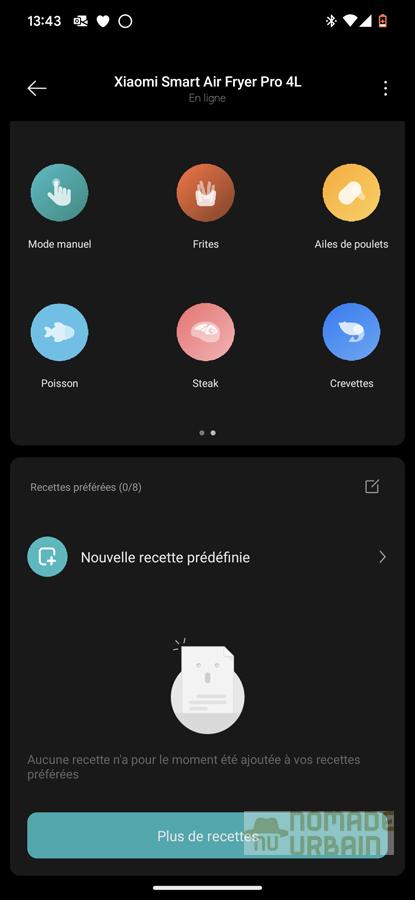 Après avoir défini la pièce dans laquelle la friteuse sera posée, vous pouvez commencer à cuisiner. En entrant dans la page dédiée à la friteuse, vous trouverez en premier lieu une section « Mode de l’appareil » qui réunit les 10 modes de cuisson préprogrammés, comme la cuisson des frites, des ailes de poulet, des crevettes, poisson et viande aussi bien blanche que rouge. Elle propose même des fonctions décongélation, déshydratations et fermentation des yaourts. Un mode Manuel permet de sélectionner vos propres paramètres.