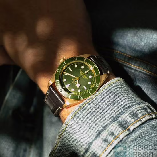 Ajoutez des aiguilles dites « Snowflake », une signature des montres de plongée TUDOR introduite en 1969, en or jaune 18 carats. Sur lesquelles Tudor applique une matière lumineuse Swiss Super-Lumi Nova grade A pour une lisibilité parfaite même dans le noir. Deux bracelets inclus, le premier en tissu Jacquard vert avec bande or et le second en cuir d’alligator marron foncé.