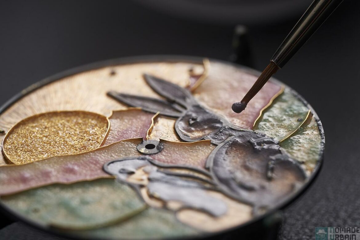Sur son cadran doré, on aperçoit un tableau riche en couleurs où un couple de lapins regardant le soleil qui se lève sur un paysage montagneux en utilisant la technique du cloisonné. Une méthode datant d’avant le Moyen Âge, qui consiste à créer des compartiments à l’aide d’un fil d’or très fin pour déposer l’émail avec la plus grande précision. Le pliage représente à lui seul jusqu’à 15 heures de travail par cadran !