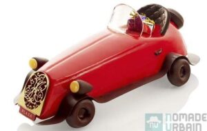 Christophe Michalak a imaginé une voiture pour enfant. Un joujou à croquer à la carrosserie en nougatine, qui cache du pain de gênes, une compotée de fraises et de crème à la violette. Les roues sont en gianduja, le parechoc en chocolat et le parebrise en sucre.