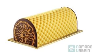 Hommage à la Corse avec une bûche aux couleurs ensoleillée, où se mêlent agrume et chocolat. Un sorbet clémentine s’associe à une glace chocolat, complété par une compotée à base de clémentines de Corse, le tout sur un biscuit aux amandes. La seule touche continentale est ma décoration en chocolat originaire d’Alsace.