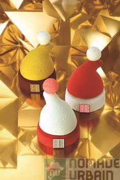 Nous sommes face à un gâteau moelleux, garni d’une crème, le tout étant recouvert d’un bonnet en chocolat. Quant au pompon, il est simplement en guimauve et bien trop petit 20comparé à notre gourmandise. Trois parfums : Magenta (chocolat) Argent (vanille & fruit) et enfin Or (Chocolat et noisette).