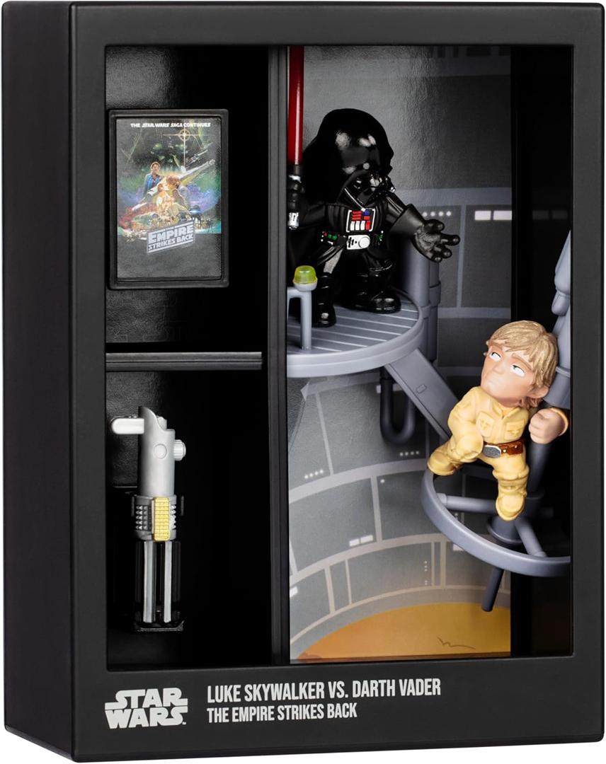Moose Toys réinvente la figurine de collection avec sa nouvelle gamme FanDrop. Dont le concept repose sur le Shadow Box ou diorama en boîte. Le modèle Luke Skywalker vs Darth Vader capture l’un des duels les plus légendaires du cinéma, tiré de L’Empire Contre-Attaque, dans un format compact et stylisé. Contrairement aux figurines d’action classiques, ces personnages possèdent un design artistique unique. Avec des proportions dynamiques, semblent figés en plein mouvement dans un décor en 3D riche en détails.