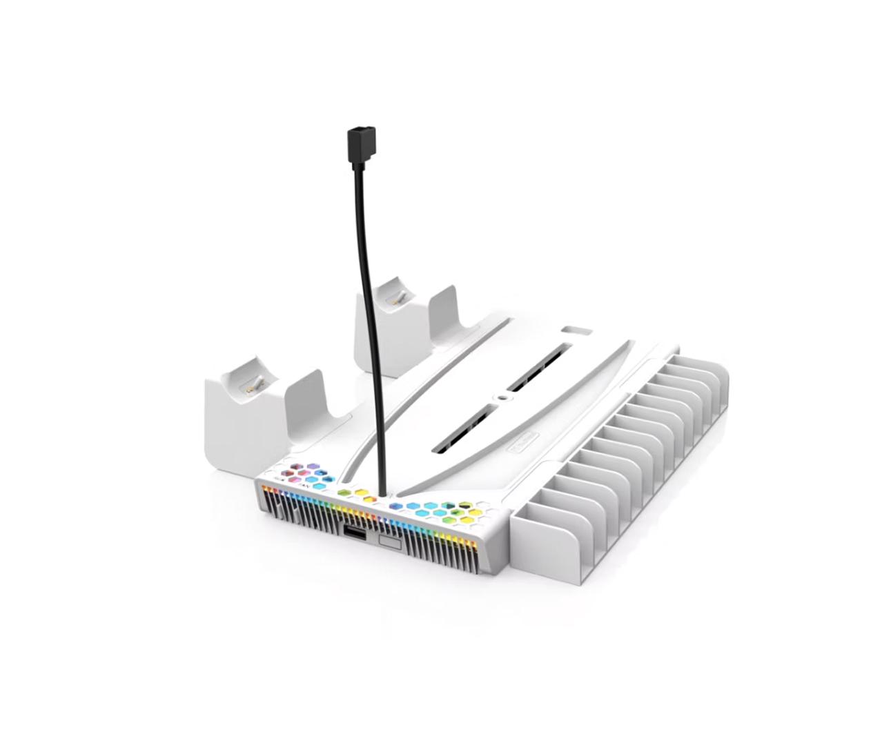 D’un côté, elle recharge deux manettes DualSense en simultané via un système magnétique Click’n Charge très pratique. De l’autre, elle offre un rangement pour votre casque gaming et jusqu’à 14 boîtes de jeux. Mais son atout majeur réside dans son socle ventilé : trois vitesses de refroidissement ajustables permettent d’extraire la chaleur de la console pour maintenir ses performances lors des longues sessions. Le tout est sublimé par une bande LED proposant 11 modes d’éclairage pour coller à votre ambiance.