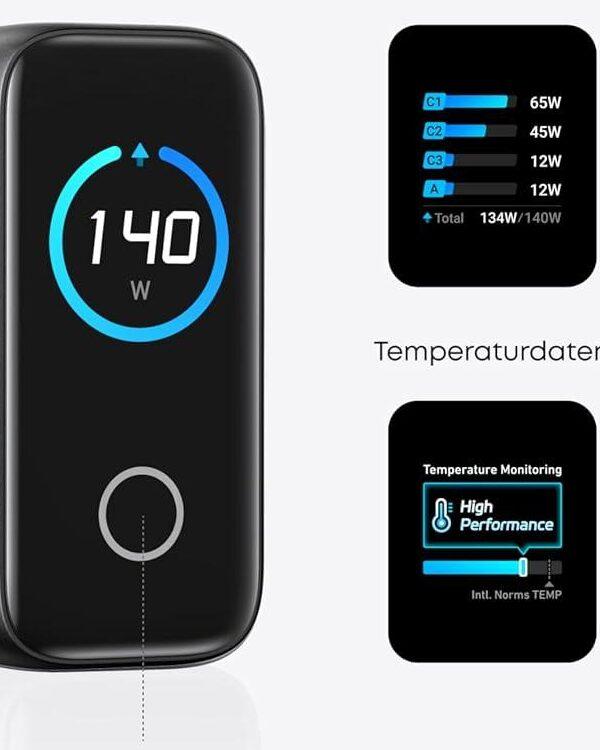 Ce qui distingue ce modèle est avant tout son écran haute définition intégré. Vous n’avez plus besoin de deviner la vitesse de charge de vos appareils. L’affichage fournit effectivement la puissance délivrée et le statut de chaque port utilisé. Côté connectivité, il offre trois ports USB-C et un port USB-A très polyvalents. Vous pouvez ainsi alimenter simultanément votre ordinateur portable et votre smartphone.