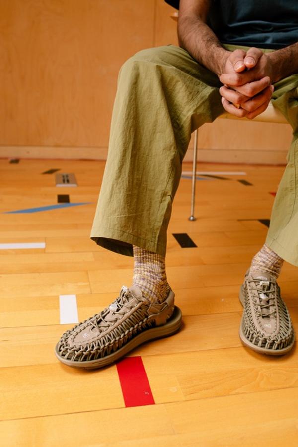 UNEEK ne tient pas sa place par son nom seul. La chaussure s’impose d’abord par sa construction, résumée par la marque en une formule simple : deux cordes et une semelle. Cette tige libre, à points d’ajustement multiples, donne au modèle sa silhouette ouverte et sa lecture immédiate. Dans la ligne homme SS26, cette base existe d’abord dans sa forme la plus aérée, puis se prolonge avec UNEEK WK, qui garde le même langage tout en rapprochant la chaussure d’une sneaker d’été.
