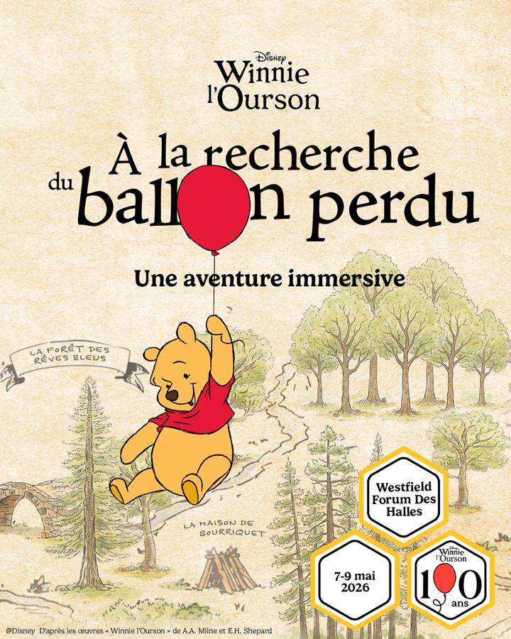 Du 7 au 9 mai 2026, le Westfield Forum des Halles accueillera « Winnie l’Ourson : à la recherche du Ballon Perdu », une animation gratuite sur inscription imaginée par Disney pour les 100 ans du personnage. À cette occasion, Winnie l’Ourson Paris prendra la forme d’un parcours dans l’univers de la Forêt des Rêves Bleus. Les visiteurs y suivront une quête autour du ballon perdu de Jean-Christophe. Disney annonce aussi des défis ludiques et des surprises sucrées tout au long de l’expérience.